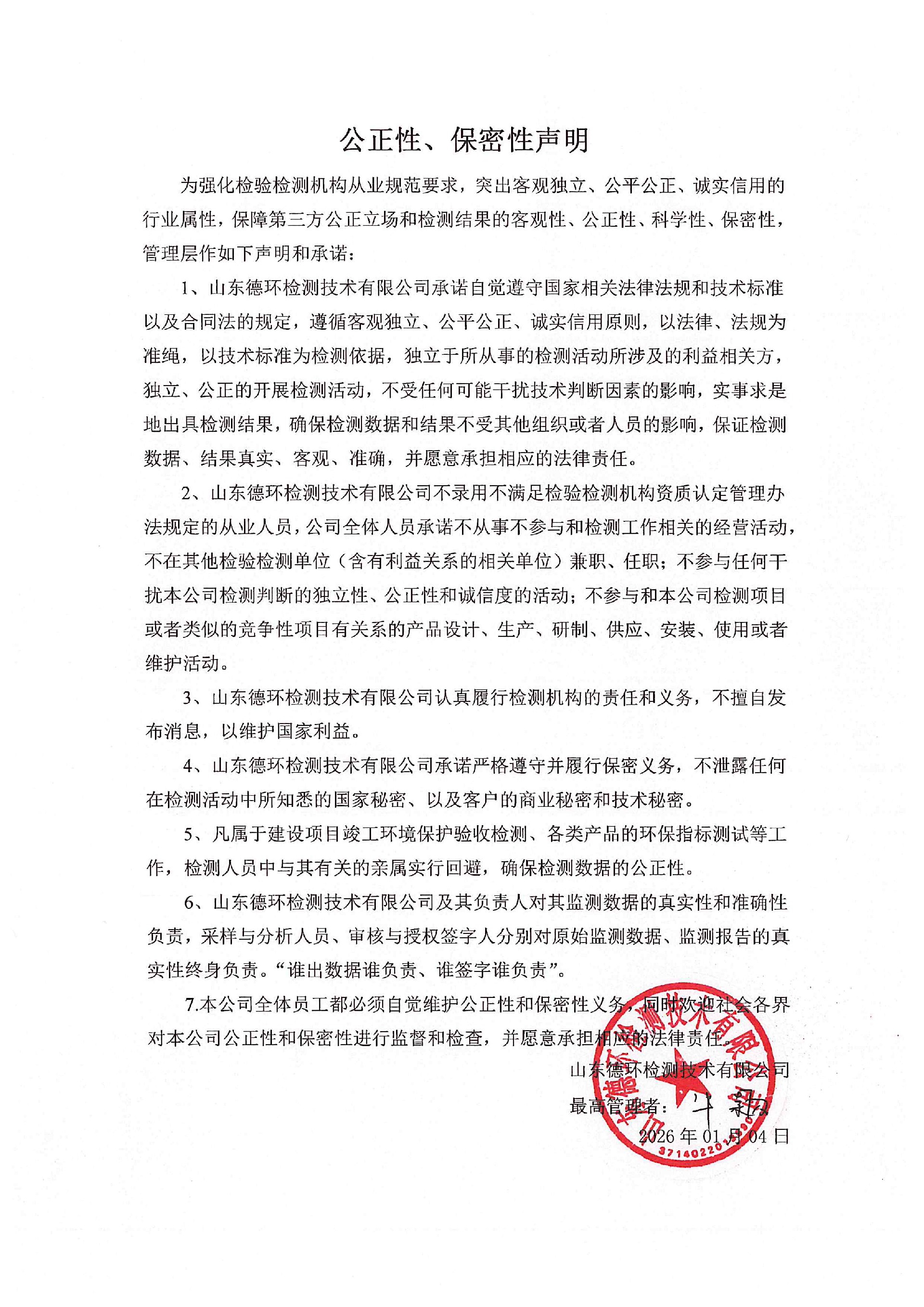 山東德環檢測技術有限公司公正性、保密性聲明